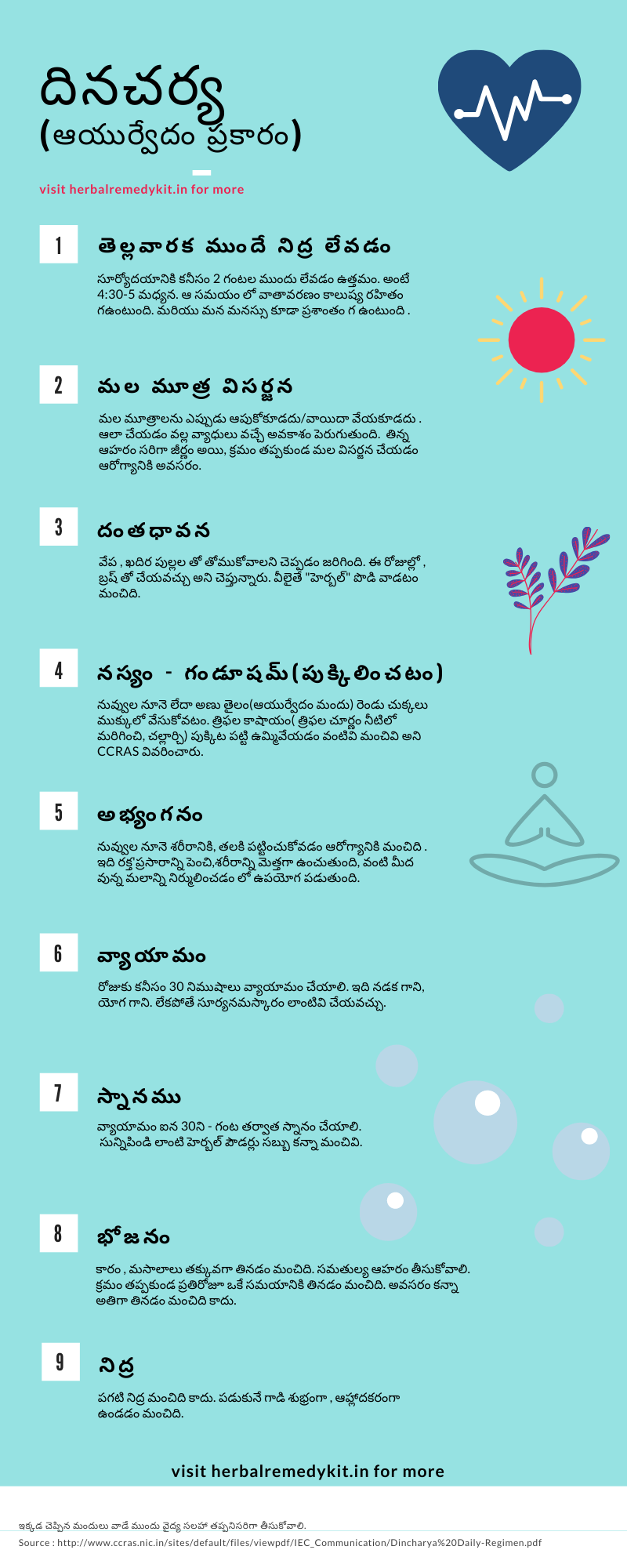తెలుసుకుందాంఆయుర్వేద దినచర్య Editor చేమే 13, 2020మే 13, 2020 Leave a Comment on ఆయుర్వేద దినచర్య ఆయుర్వేదం ప్రకారం పాటించ వలిసిన దినచర్య Source : http://www.ccras.nic.in/sites/default/files/viewpdf/IEC_Communication/Dincharya%20Daily-Regimen.pdf దీన్ని పంచుకోండి: వాట్సాప్ లో పంచుకోవడానికి నొక్కండి (కొత్త విండోలో తెరుచుకుంటుంది) వాట్సాప్ Click to share on X (కొత్త విండోలో తెరుచుకుంటుంది) X Click to share on Facebook (కొత్త విండోలో తెరుచుకుంటుంది) ఫేస్బుక్ మరిన్ని Click to share on Reddit (కొత్త విండోలో తెరుచుకుంటుంది) రెడ్డిట్ Click to share on Pocket (కొత్త విండోలో తెరుచుకుంటుంది) పాకెట్ Click to share on Telegram (కొత్త విండోలో తెరుచుకుంటుంది) టెలిగ్రామ్ ఇలాంటివే